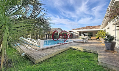 Située dans un quartier calme et recherché du haut Bouliac, Déclic Immo vous propose en exclusivité cette magnifique villa contemporaine de 175m² qui se distingue par ses prestations de qualité, au sein d'un environnement calme et verdoyant. La villa est construite sur 2 niveaux comprenant 5 chambres, un bureau et un garage attenant à la maison. Au rez-de-jardin, vous découvrirez une entrée suivie d'un vaste salon salle à manger de 65m² avec de grandes ouvertures, offrant un espace de vie lumineux et chaleureux, tourné vers la terrasse, la piscine et le jardin. La cuisine ouverte est entièrement équipée et possède un ilot central avec un bar, formant un espace convivial, tourné à la fois vers la salle à manger et le salon. L'espace nuit comprend une suite parentale avec son dressing et sa salle d'eau privative. À ce niveau, vous trouverez également un bureau, un wc, un cellier / buanderie et un garage attenant. Un escalier mène à l'étage, comprenant 4 chambres complémentaires de 9 à 12m², un wc et une seconde salle d'eau. L'extérieur comprend un agréable jardin paysagé entourant la maison et une piscine chauffée. Une belle terrasse équipée d'une pergola bioclimatique permet de profiter pleinement des beaux jours. Cet espace invite à la détente avec une vue dégagée sur la campagne environnante. L'environnement calme et sans vis-à-vis offre un cadre de vie paisible et intimiste. La maison bénéficie de tout le confort d'une maison moderne, avec une performance énergétique optimale grâce à la pompe à chaleur pour le chauffage et la climatisation. Points forts : - Emplacement privilégié dans le haut Bouliac - Environnement calme, paisible et intimiste - Surface et luminosité de la pièce de vie - Jardin paysagé avec piscine chauffée et garage Infos pratiques : - Commerces du centre de Bouliac à 4 min en voiture - Écoles maternelle et primaire de Bouliac à 4 min en voiture - Piste cyclable à proximité - Accès rocade en 7 min en voiture - Gare St Jean à 15min et aéroport de Bordeaux-Mérignac à 25 min en voiture Pour tout renseignement complémentaire ou visite, veuillez contacter Alexandre Micheau. Réf 2217. DECLIC IMMO 33 DPE : A Les informations sur les risques auxquels ce bien est exposé sont disponibles sur le site Géorisques : Annonce proposée et rédigée sous la responsabilité éditoriale de MICHEAU Alexandre - Honoraires : 4,29 % TTC inclus charge acquéreur (815 000 euros hors honoraires) Montant estimé des dépenses annuelles d'énergie pour un usage standard : entre 850 euros et 1 210 euros par an.