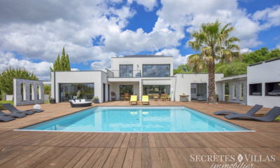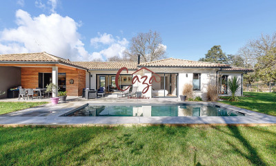 Située sur les hauteurs très recherchées de Bouliac, au sein d'un environnement résidentiel d'exception, cette remarquable villa contemporaine de plus de 250 m² offre un cadre de vie rare, à seulement 15 minutes du centre de Bordeaux. Nichée à l'abri des regards, en fond d'allée privée, elle prend place sur un superbe terrain paysager de plus de 2 000 m², orienté plein sud et sublimé par une piscine chauffée de 13 x 4 mètres, au sel, dotée d'un rideau électrique immergé. Développée en grande partie de plain-pied, la villa séduit dès l'entrée par ses volumes, sa luminosité et son esprit résolument contemporain. La pièce de réception, d'environ 90 m², baignée de lumière grâce à de larges baies vitrées, s'ouvre sur plusieurs terrasses et dispose d'une élégante cheminée double foyer. Une cuisine ouverte, entièrement équipée, complète harmonieusement cet espace de vie. La maison accueille une superbe suite parentale avec dressing sur mesure, salle d'eau haut de gamme (double vasque, double douche italienne), WC indépendant et vue imprenable sur le jardin. Une seconde suite, également en rez-de-chaussée, dispose d'un espace généreux et de sa propre salle d'eau. Deux bureaux, une lingerie et une buanderie complètent ce niveau. À l'étage, deux chambres avec rangements se partagent une salle d'eau moderne. L'une d'elles bénéficie d'un accès direct à une terrasse privée. Un salon TV – ou chambre supplémentaire – vient parfaire l'espace nuit. Un vaste garage, une cave, un atelier ainsi qu'une dépendance d'environ 45 m² offrent de nombreuses possibilités. Les prestations sont à la hauteur des lieux : chauffage au sol par pompe à chaleur, climatisation réversible, huisseries aluminium, volets roulants motorisés, fibre, alarme Verisure, arrosage automatique, pergola bioclimatique, visiophone, portail électrique, robot tondeuse.. À proximité immédiate des écoles, commerces et transports, cette villa allie harmonieusement architecture contemporaine, confort moderne et emplacement privilégié.