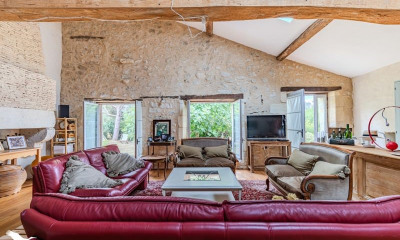 Située au bout d'une paisible impasse, cette magnifique ferme en pierre allie le charme de l'ancien à de généreux espaces de vie et à des vues imprenables s'étendant à perte de vue. À l'intérieur, la propriété offre de grandes pièces à vivre lumineuses; idéales pour recevoir comme pour la vie quotidienne en famille ; ainsi qu'une chambre polyvalente au rez-de-chaussée avec salle de bains privative, et trois autres chambres à l'étage. La maison est élégamment décorée, alliant avec goût les éléments de caractère au confort moderne. Les jardins ont été conçus avec soin comme une série de « pièces » extérieures, chacune avec son propre caractère : un charmant roseraie, un potager productif et une piscine avec terrasse ensoleillée, parfaitement orientée pour profiter du spectaculaire paysage environnant. Une opportunité rare d'acquérir une maison pleine de caractère dans un cadre paisible, offrant à la fois intimité et style de vie enviable. (6.00 % d'honoraires TTC à la charge de l'acquéreur.)