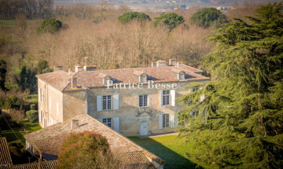 Au sud de Bordeaux, proche de Langon, une maison de maître girondine retouchée au 19e s , avec 10 chambres, et son parc de plus de 1,5 ha avec piscine. Au bout d'un petit village, la maison est entourée par la campagne, avec un voisinage tenu à bonne distance, dans un paysage de champs, de prairies et de bois. À l'écart de la petite route départementale qui le dessert, un chemin mène à l'entrée de la propriété pour découvrir le logis principal, entouré d'un espace enherbé et boisé, orienté plein sud et incluant une grande piscine un peu en retrait. Mentionnée sur la carte de Cassini, la demeure est élevée de deux niveaux, séparés par un bandeau d'étage en pierre, sous combles aménageables. Elle est orientée est-ouest et divisée en trois : un corps central en saillie et deux ailes, plus basses et en appui, dont les toitures sont prolongées au nord pour abriter les dépendances. Non loin, se tiennent un petit pavillon flanqué de quatre tourelles, renfermant une serre et quelques remises, ainsi que, à l'arrière, un vieux hangar à tabac. Le parc s'étend à la fois à l'avant et à l'arrière de la maison, donnant ainsi des espaces où alternent calme et animation.