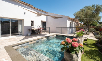 Villa contemporaine 4 chambres avec piscine et garage Idéalement située dans un quartier résidentiel recherché, à proximité des commodités, cette villa contemporaine non mitoyenne construite en 2019 développe environ 112 m² habitables sur un terrain de 300 m². Le rez-de-chaussée accueille une vaste pièce de vie lumineuse ouverte sur la terrasse et la piscine, ainsi qu'une suite parentale avec salle d'eau privative et dressing. Un WC indépendant et un accès direct au garage complètent ce niveau. À l'étage, trois chambres confortables ainsi qu'une salle d'eau moderne avec WC offrent un espace nuit parfaitement adapté à la vie de famille. L'extérieur facile d'entretien, propose un agréable jardin avec piscine et terrasse pour profiter pleinement des beaux jours. La maison dispose de prestations modernes et de qualité : climatisation, menuiseries aluminium, volets roulants motorisés, carrelage grand format, cuisine équipée, garage spacieux et deux stationnements privatifs. Une villa récente aux volumes bien pensés et au confort immédiat, à découvrir sans tarder. Honoraires à la charge du vendeur Votre agent commercial 3G IMMO sur place EI - Jean-Marc FONTANA inscrit au RSAC de MONTPELLIER n° 400 820 502 Selon l'article L.561.5 du Code Monétaire et Financier, pour l'organisation de la visite, la présentation d'une pièce d'identité vous sera demandée. Les informations sur les risques auxquels ce bien est exposé sont disponibles sur le site Géorisques :