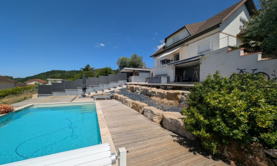 Montcarra, Villa nichée au calme dans un environnement privilégié, cette maison de 153 m² habitables vous séduira par ses volumes généreux, son caractère et ses prestations de qualité. Cette maison pleine de charme propose une belle hauteur sous plafond avec poutres apparentes offrant à la pièce de vie une atmosphère chaleureuse et authentique. L’espace principal, lumineux et convivial, s’ouvre naturellement vers l’extérieur, créant un lieu de vie idéal. La partie nuit se compose de quatre chambres, parfaitement agencées pour offrir confort et intimité à chacun. À l’étage, la suite parentale bénéficie d’une salle de bain privative ainsi que d’une belle terrasse avec une vue dégagée sur le jardin paysager. Les trois autres chambres, situées à l’étage intermédiaire, partagent une salle d’eau dédiée. Pour les besoins du quotidien, une mezzanine d’environ 20 m² offre un espace supplémentaire facilement aménageable en coin télétravail, salle de jeux ou bibliothèque. La cuisine, moderne et entièrement équipée, a été conçue avec des matériaux de qualité. Côté pratique, la maison dispose de trois garages, d’un atelier, d’une buanderie et de nombreux rangements. Enfin, le confort moderne est au rendez-vous : chauffage au sol alimenté par une pompe à chaleur de 2021, poêle à granulés dans le salon, panneaux solaires pour une consommation d’énergie maîtrisée, adoucisseur d’eau et diagnostic de performance énergétique : classe B. À l’extérieur, on découvre deux terrasses : une grande terrasse couverte, idéale pour profiter des repas en plein air quelle que soit la saison, et une seconde terrasse située à l’opposé, parfaite pour suivre le soleil au fil de la journée. Au cœur du jardin, une grande piscine de 5,5 x 11 mètres s’intègre harmonieusement dans le décor, entourée de verdure et à l’abri des regards. Le tout est implanté sur un terrain paysagé , véritable écrin de nature, avec ses arbres matures, ses pelouses soignées et ses espaces aménagés qui invitent à la détente. Cette maison combine charme, modernité et fonctionnalité, dans un cadre paisible, proche des commodités, tout en offrant un vrai havre de paix.