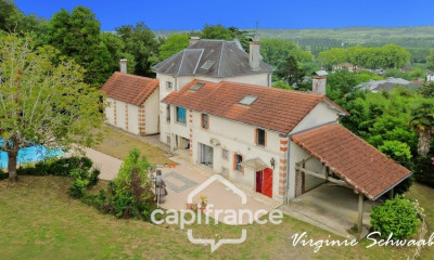 iad France - Geoffrey BERNATEAU DE GIRODON vous propose: Bien très rare sur le secteur : Dans un quartier calme et très recherché sur les hauteurs de Peyrehorade, venez découvrir cette maison d'architecte (Jean-Raphaël Hébrard) des années 1980 de construction traditionnelle de 300 m² sur un terrain arboré de 6000 m². Cette demeure toujours entretenue avec soin offre un cadre de vie paisible pour toute la famille. En franchissant le seuil de cette propriété, vous serez immédiatement séduit par l'authenticité des lieux. Un vaste hall d'entrée s'ouvre sur un salon cathédrale élégant très lumineux équipé de sa cheminée et d'une bibliothèque, une salle à manger conviviale, une cuisine séparée spacieuse entièrement équipée et aménagée , une buanderie, une très grande suite parentale équipée d'un dressing, une salle de bain avec double vasque + douche, bidet et baignoire ainsi qu'un WC séparé, un bureau, une salle de soin ou autre selon vos besoins (idéal pour une activité libérale.. etc) et un WC indépendant. A l'étage, un palier avec vue sur le salon qui dessert une belle suite parentale avec sa salle de bain équipée d'une baignoire, un bidet et un WC. En rez-de-jardin, on y trouve une pièce qui permettra à votre imagination de s'exprimer pour créer un espace convivial et fonctionnel avec accès direct sur la piscine, une cave, trois chambres équipées de rangements et vue sur la piscine, une salle d'eau et un WC indépendant. Côté extérieur, vous serez subjugué par le coin terrasse avec une vue exceptionnelle sur toute la chaine des Pyrénées qui vous propose un espace détente pour profiter des journées ensoleillées et des belles soirées en famille ou entre amis avec un coin barbecue/plancha, une piscine pour des moments de détente inoubliable , un garage fermé de 21 m², une remise ou vous pourrez aménager un atelier de bricolage ou autre selon vos besoins ainsi qu'un espace couvert pour garer deux voitures. Les amoureux de la nature apprécieront le vaste jardin arboré et parfaitement entretenu, idéal pour les jeux et les moments de plaisir en plein air. Maison chaleureuse proposant de belles prestations avec des matériaux nobles et des finitions soignées, double vitrage avec des grandes baies vitrées coulissantes qui apporte une belle luminosité avec une très belle exposition, toiture en très bon état, parquet massif pour toute la partie salon/séjour et bureau, nombreux rangements, fibre disponible idéal pour télétravail. Idéalement située à trois minutes de l'autoroute et des grands axes, 2 minutes du centre-ville de Peyrehorade et toutes les commodités, 30 minutes de Bayonne et des plages, 45 minutes de l'aéroport de Biarritz en voiture. Ne manquez par cette opportunité d'acquérir ce joyau immobilier et contactez-moi pour organiser une visite et laissez-vous tenter par le charme intemporel de cette propriété d'exception et son cadre idyllique qui offre un véritable oasis de tranquillité. Je suis disponible 7jours/7 et je m'adapte en fonction de votre planning. Honoraires d'agence à la charge du vendeur. Information d'affichage énergétique sur ce bien : classe ENERGIE D indice 171 et classe CLIMAT D indice 47. Les informations sur les risques auxquels ce bien est exposé, y compris l'obligation légale de débroussaillement, sont disponibles sur le site Géorisques : La présente annonce immobilière a été rédigée sous la responsabilité éditoriale de M Geoffrey BERNATEAU DE GIRODON mandataire indépendant en immobilier (sans détention de fonds), agent commercial de la SAS I@D France immatriculé au RSAC de dax sous le numéro 879514339, titulaire de la carte de démarchage immobilier pour le compte de la société I@D France SAS.
