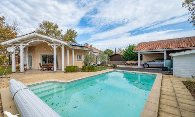 Sanguinet, dans un quartier très prisé qui borde le lac. Superbe contemporaine de 2017, composée d'une entrée avec placards, une belle pièce de vie double et lumineuse avec cuisine américaine entièrement équipée, une buanderie et 3 suites parentales. La villa dispose d'un chauffage gainable réversible Airzone et d'une belle hauteur sous plafond offrant de grands volumes. Côté extérieur, beau jardin paysagé avec arrosage automatique, piscine au sel avec jacuzzi intégré, studio indépendant et garage carrelé de 32m2. Le tout au calme et sans vis à vis. Villa parfaitement entretenue avec de belles prestations située à quelques minutes à pieds du lac, des commodités et des écoles. Classe énergie B, Classe climat A Montant estimé des dépenses annuelles d'énergie pour un usage standard : entre 830.00 euros et 1168.00 euros sur les années 2021, 2022 et 2023 (abonnements compris). Les informations sur les risques auxquels ce bien est exposé sont disponibles sur le site Géorisques : georisques.gouv.fr.