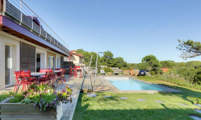 Chez Novarea, on aime les maisons où l'architecture se met au service du bien-être. À deux pas du lac d'Hossegor et du centre-ville, cette maison d'architecte de 2021 incarne un art de vivre entre nature et modernité. Ses volumes lumineux et son vaste séjour prolongé par une terrasse invitent à la convivialité. La cuisine ouverte, sobre et fonctionnelle, s'accompagne d'une arrière-cuisine discrète. La suite parentale du rez-de-chaussée, avec dressing et salle de bain privative, offre un confort au quotidien. À l'étage, trois chambres et deux salles d'eau composent un espace nuit harmonieux pour famille et amis. Le jardin paysagé et la piscine apportent une touche de sérénité à cet ensemble contemporain. Son atout superstar : une architecture élégante et baignée de lumière, à seulement quelques minutes du lac et de l'océan. Ce que l'on aime chez Novarea : une maison pensée pour durer, où design et douceur de vivre landaise ne font qu'un. Emplacement privilégié, à proximité des commerces, des écoles et des plages, dans l'un des quartiers les plus recherchés d'Hossegor. Envie d'en savoir plus ? De visiter ? Contactez vite Novarea !
