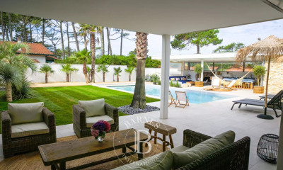 Au coeur d'un environnement boisé à Soorts-Hossegor, cette villa d'architecte développant 260 m² offre une atmosphère lumineuse et chaleureuse, entièrement pensée pour accueillir une vie familiale . Implantée sur un terrain paysager de 1 801 m², elle bénéficie de nombreux atouts à seulement quelques minutes du littoral. Dès l'entrée, la pièce de vie impressionne par ses volumes et ses larges baies vitrées ouvrant sur l'espace piscine. Les perspectives intérieures se prolongent vers de vastes terrasses, créant un véritable lien dedans-dehors. Le séjour traversant accueille un séjour baignée de lumière et une cuisine contemporaine entièrement équipée, pensée comme un espace central de partage. La maison dispose de quatre chambres, dont une suite élégante avec sa salle d'eau et son accès direct à l'extérieur. Les autres chambres, spacieuses et confortables, se répartissent autour d'espaces de circulation fluides, offrant une grande fonctionnalité au quotidien. Une seconde zone au sous-sol, modulable selon les besoins, est actuellement aménagée en salle de sport, buanderie et salle de jeux. À l'extérieur, la piscine s'intègre harmonieusement dans un écrin végétal préservé. La grande terrasse offre une diversité d'ambiances pour profiter pleinement des beaux jours. Le jardin, soigneusement aménagé, invite à la détente dans une atmosphère paisible, sans vis-à-vis. Alliance réussie entre architecture contemporaine, luminosité et nature, cette propriété se distingue par son emplacement, son confort et ses lignes intemporelles. CLASSE ENERGIE : C CLASSE CLIMAT : A Montant moyen estimé des dépenses annuelles d'énergie pour un usage standard, établi à partir des prix de l'énergie de l'année 2025 : entre 2640 euros et 3650 euros. Contact Stéphan DE VALK RSAC n° 533 152 955 Dax Stéphan DE VALK (EI) Agent Commercial - Numéro RSAC : 533 152 955 - DAX.