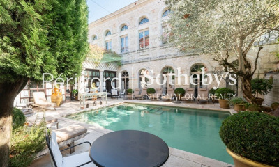 En Aquitaine, au-dessus des rives du Lot, un logis du Bailli adossé à une abbaye bénédictine du 13e s., avec maison d'amis et piscine. La demeure est dressée en surplomb du Lot, au coeur de la vieille ville et adossée à une abbaye bénédictine chargée d'histoire. Une ruelle médiévale mène au portail de bois de la maison. Le mur extérieur est en pans de bois à hourdis de briquettes. La fenêtre donnant sur la rue affiche de modestes meneaux de bois, mais ceux des baies de la façade sud, invisibles de la rue, sont en pierre : en pays huguenot, la richesse est toujours intérieure.. Le portail ouvre sur une courette pavée séparant les deux ailes d'habitation. Face à l'entrée, le mur de l'abbatiale sert d'appui au préau qui mène au jardin. Clos par un portillon, celui-ci est dominé par la nef de l'abbaye et ses fenêtres ogivales à vitraux et entouré d'une épaisse haie de buis qui protège aussi la piscine. Un autre portillon donne accès au second jardin-terrasse de la grande maison livrant une vue splendide sur la vallée du Lot jusqu'aux coteaux du pays de Serre. Le terrain très en pente descend jusqu'à la rivière.