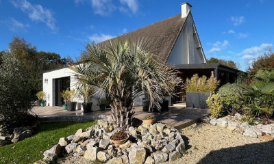 À 10 min d'une cité du Cotentin, une maison du 19e s., avec dépendance, gîte, étang et un jardin de 5000 m². Accessible par une rue qui traverse le bourg, la propriété est située sur les hauteurs des marais et profite d'une vue dégagée sur la campagne normande. La maison fait face à l'ensemble du terrain, flanquée de part et d'autres par le gîte et la dépendance. L'étang est au centre. Le bas du jardin se prolonge par un petit chemin piétonnier. Construit au 19e s. en moellon de schiste, le logis principal est élevé de deux niveaux dont les combles. La toiture en ardoise est à deux pans. Une extension a été ajoutée au bâtiment d'origine dans les années 2000.