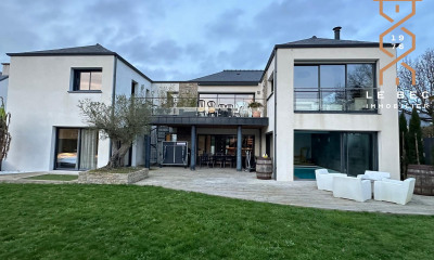 Maison d'architecte à Baden avec vue imprenable sur le Golfe du Morbihan. Situation exceptionnelle !Nichée dans un charmant hameau de Baden, cette superbe maison d'architecte offre une vue sur la rivière d'Auray et le Golfe du Morbihan. Vous serez immédiatement séduit par ses volumes généreux, sa luminosité et son cadre de vie rare et préservé. Des espaces de vie fonctionnels :Au rez-de-chaussée, la pièce de vie principale bénéficie d'une belle hauteur cathédrale, baignée de lumière grâce à ses larges baies vitrées ouvrant sur une terrasse exposée plein sud. Une cuisine aménagée et équipée vient compléter cet espace convivial. Une première chambre y est également disponible, offrant un accès de plain-pied. En souplex, deux chambres supplémentaires avec une salle d'eau ouvrent elles aussi sur une terrasse, offrant la possibilité d'un logement indépendant ou d'un espace dédié à la famille ou aux invités. À l'étage, trois chambres, un bureau, une salle de bains et des WC séparés permettent d'accueillir confortablement toute la famille. Le tout sur un terrain clos et arboré de plus de 1000 m², garantissant calme, intimité et cadre verdoyant. Bien rare à visiter! réf VA2506009 Honoraires inclus de 3% TTC à la charge de l'acquéreur. Prix hors honoraires 1 150 000 euros. Classe énergie D, Classe climat B Montant estimé des dépenses annuelles d'énergie pour un usage standard : entre 2360.00 euros et 3270.00 euros sur les années 2021, 2022 et 2023 (abonnements compris). Les informations sur les risques auxquels ce bien est exposé sont disponibles sur le site Géorisques : georisques.gouv.fr.