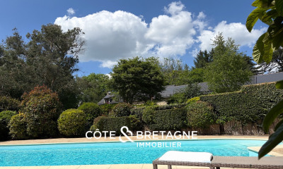 En exclusivité dans vos agences LOGE 7 Immobilier de Guidel et de Clohars-Carnoët, Située dans un environnement calme et résidentiel, cette maison de plain-pied à l'architecture fonctionnelle séduit par ses volumes généreux, sa belle luminosité et sa circulation fluide, idéale pour la vie de famille. Elle s'organise autour d'un espace de vie central, d'une zone nuit bien distincte et d'un volume annexe regroupant garage et appartement indépendant. Ce qui fait la différence ici, c'est l'intelligence du plan : tout de plain-pied, tout à portée de main. Rien n'a été laissé au hasard — chaque mètre carré a été pensé pour le confort du quotidien. L'entrée dessert un dégagement menant aux chambres, au salon/salle à manger ou à la cuisine. La cuisine, d'une surface de 17 m², est à la fois spacieuse et conviviale, avec son coin repas et son accès direct à la terrasse. Elle communique avec un dégagement technique qui conduit à un vaste salon-séjour traversant de 42 m², baigné de lumière grâce à ses grandes baies vitrées ouvrant sur le jardin et deux terrasses. Les terrasses offrent deux orientations : à l'Est, 40 m² pour profiter du petit-déjeuner au soleil ; au Sud/Sud-Ouest, près de 50 m² pour les repas d'été et les moments de détente. La partie nuit, bien distincte, comprend quatre chambres confortables (de 10 à 17 m²), toutes équipées de placards et de baies vitrées donnant sur la terrasse, dont une suite parentale avec salle d'eau privative et WC. Un bureau séparé permet d'aménager un coin lecture ou un espace de télétravail. Une grande salle de bains familiale avec double vasque, douche, baignoire et WC vient compléter cet espace. Dans le couloir reliant la cuisine aux chambres, un second WC indépendant avec lave-mains apporte un confort supplémentaire. Véritable atout de la propriété, un appartement indépendant vient compléter l'ensemble. Accessible depuis le bureau, le garage ou une entrée privative sous carport, il offre un véritable logement attenant comprenant une pièce de vie avec cuisine ouverte, une chambre, une salle d'eau avec WC et une terrasse pavée privative. Un espace idéal pour recevoir, accueillir un proche, loger un adolescent ou exercer une activité professionnelle (télétravail, profession libérale, location saisonnière…). Les extérieurs sont à l'image de la maison : pensés pour le plaisir et la convivialité. Terrain plat avec piscine couverte et chauffée, terrain de pétanque, abri de jardin, carport en accès direct à l'entrée et pergola bioclimatique complètent ce cadre de vie rare et parfaitement abouti.