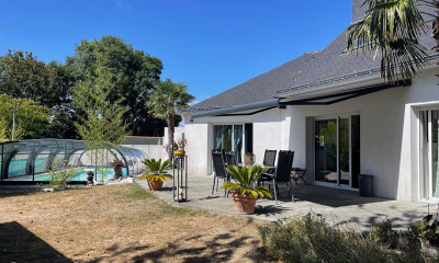 Située dans un village authentique de la campagne de Kervignac, cette superbe longère en pierre offre une expérience de vie unique. Ce bien d'exception, d'une surface généreuse, est composé de deux logements distincts et d'un atelier aménageable. La rénovation de grande qualité et la décoration soignée confèrent à cette propriété un charme indéniable. La maison principale s'ouvre sur un premier salon - salle de billard au coin du feu. En progressant dans la maison, un grand et lumineux salon vous tend les bras, une cuisine aménagée et équipée, un cellier, un grand bureau fonctionnel, un séjour verdoyant tourné vers le jardin, une chambre avec salle d'eau et un WC. L'étage dispose quant à lui, de deux chambres, dont une avec dressing, et l'autre avec salle de bain balnéo et douche privatives, un WC. La seconde partie de l'étage offre un espace entièrement indépendant baigné de lumière comprenant une chambre avec salle d'eau privative, un WC, une pièce de vie avec séjour et cuisine ouverte, prolongée par une terrasse. Le second logement attenant propose au rez-de-chaussée un salon-séjour, une cuisine ouverte aménagée et équipée, un cellier et un WC. L'étage se compose d'une chambre avec salle de bain privative et terrasse, une seconde chambre, un grenier aménageable, une salle d'eau et un WC. L'annexe aménageable sur deux niveaux, avec sa grande ouverture, laisse imaginer de nombreuses possibilités : atelier d'artiste, espace de vie indépendant, etc. L'extérieur invite à la détente avec un jardin paysager et une vue sur la campagne environnante. Un garage complète cet ensemble. La proximité des écoles, des commerces et services, facilite le quotidien et les plages sont accessibles en 15 minutes seulement. Ce bien atypique, résultat d'une rénovation soignée, offre des prestations haut de gamme et des performances énergétiques remarquables. Il constitue une opportunité rare pour les acquéreurs en quête d'un lieu de vie singulier et accueillant située à quelques minutes du littoral et de Lorient. CLASSE ENERGIE : A / CLASSE CLIMAT : A Montant moyen estimé des dépenses annuelles d'énergie pour un usage standard établi à partir des prix de l'énergie des années 2021, 2022, 2023 : entre 800 € et 1160 €/an Les informations sur les risques auxquels ce bien est exposé sont disponibles sur le site géorisques : Simon JOUANNO RSAC Lorient 929 999 316 Simon JOUANNO (EI) Agent Commercial - Numéro RSAC : 929999316 - LORIENT.