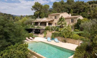 Situé dans un quartier recherché et au calme, sur les hauteurs à la limite de Saint Paul de Vence, ce beau mas tout en pierre a été dessiné par l'architecte de renom Robert Dallas dans les années 1990. D'une surface de 230m2 habitable, il se compose au rez de chaussée, une entrée donnant sur un salon très lumineux avec une belle cheminée en pierre et un coin bureau. Les fenêtres s'ouvrent entièrement pour donner accès à une longue terrasse. Les sols sont en pierre ancienne, et les plafonds avec poutres apparentes. Une cuisine complète et ouverte sur la salle à manger est très conviviale. Le premier étage dessert 3 chambres avec des balcons et beneficient de belles vues. La suite parentale possède un dressing et une salle de bain. Les deux autres chambres ont de nombreux rangements et salles de bains. Le rez de jardin est un vaste appartement, se composant d'une grande pièce de vie, une salle de bain, une cuisine et une terrasse. Le jardin d'une superficie de 3200m2 est magnifiquement entretenu, avec de beaux et grands arbres méditerranéens, un terrain de boules, un grand pool house tout équipé pour les repas extérieurs et une grande piscine pour se rafraîchir. Un garage pour 2 véhicules. Portail automatique, arrossage et éclairage extérieur, chauffage au sol par système de pompe à chaleur air/eau, et alarme viennent compléter ce bien. Ce mas présente de belles prestations et est idéal pour accueillir une famille.