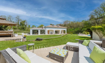 Idéalement située à quelques pas du charmant village de Valbonne, cette villa impeccablement présentée offre un havre de sérénité avec l'avantage d'avoir toutes les commodités locales à votre porte - le parfait mélange de tranquillité et de proximité. Baignée de lumière naturelle grâce à son orientation sud-ouest, la propriété est située au milieu de jardins magnifiquement paysagés, avec une grande piscine, un gazebo et plusieurs espaces extérieurs - idéaux pour recevoir ou se détendre. Au rez-de-chaussée, vous trouverez une cuisine contemporaine élégante et entièrement équipée avec un bar, une salle à manger attenante, un salon lumineux et spacieux avec une cheminée. La caractéristique remarquable est le magnifique salon d'été avec des fenêtres entièrement rétractables, connectant harmonieusement l'intérieur au jardin pour une véritable vie en plein air. La suite principale s'ouvre sur l'accès au jardin et comprend un dressing et une luxueuse salle de bain attenante. Une suite d'invités complète le niveau principal. Le premier étage propose deux autres suites avec chacune sa propre salle de bain privée, ainsi qu'un généreux grenier comme espace de rangement. Le niveau inférieur comprend un grand garage, une buanderie, une cave à vin, une salle de sport, un espace de rangement supplémentaire et une chambre d'invités avec salle de bain attenante. Climatisation réversible dans toute la maison. Une combinaison exceptionnelle de confort, d'élégance et de commodités, située dans l'un des lieux les plus prestigieux de la Côte d'Azur. Les informations sur les risques auxquels ce bien est exposé sont disponibles sur le site Géorisques : www.georisques.gouv.fr