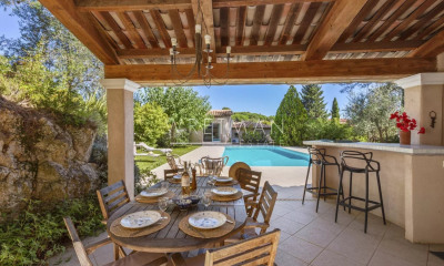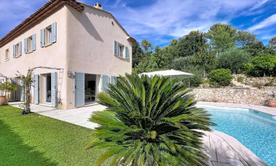 Située à proximité de Valbonne, cette villa de luxe récemment construite incarne l'élégance et le confort moderne. Conçue avec des matériaux de haute qualité, elle offre un cadre de vie exceptionnel, alliant design contemporain et espaces généreux. La villa se compose de plusieurs niveaux, comprenant un vaste salon lumineux, une cuisine ouverte équipée de manière haut de gamme, ainsi qu'une salle à manger. Chaque espace bénéficie d'une luminosité naturelle grâce aux larges baies vitrées, qui offrent une vue imprenable sur le jardin paysager et la piscine. Elle dispose de quatre chambres en suite, chacune avec son propre dressing et de nombreux rangements. Une charmante maison d'invités, indépendante, permet d'accueillir famille et amis en toute intimité. L'espace extérieur, quant à lui, offre une grande piscine entourée d'une terrasse en pierre, créant ainsi un cadre privé et exclusif. De nombreux espaces de détente, un jardin parfaitement aménagé et une cuisine d'été invitent à profiter pleinement des repas en plein air. La villa inclut également une salle de cinéma, une salle de sport, une cave à vin, ainsi qu'une buanderie et une cave technique, apportant tout le confort nécessaire à un mode de vie moderne. Le terrain plat, bien que privé et non vis-à-vis, présente un jardin soigné avec des arbres typiques de la région provençale, ainsi qu'un terrain de boules et un potager. Son emplacement est idéal, offrant un accès rapide à Valbonne et à toutes les commodités locales, écoles, commerces et golfs. L'aéroport international se trouve à seulement 20 minutes, facilitant les déplacements pour les voyageurs. À voir absolument ! Des informations sur les risques auxquels cette propriété est exposée sont disponibles sur le site Géorisques : www.georisques.gouv.fr