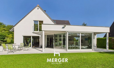 À seulement 15 minutes de Strasbourg, nichée sur les hauteurs prisées de Mittelhausbergen, cette maison contemporaine développe une surface de 365 m² au sol, dont 300 m² habitables, sur un terrain de 9,87 ares. Située en lisière de forêt et à l'abri des regards, elle offre une vue dégagée jusqu'à la Cathédrale de Strasbourg. Conçue pour répondre à un art de vivre élégant et confortable, elle se distingue par ses prestations de qualité, ses volumes généreux et sa luminosité omniprésente. L'entrée s'ouvre sur une vaste pièce de vie de plus de 90 m² baignée de lumière naturelle grâce à ses grandes baies vitrées. Ce séjour traversant, avec son parquet massif en chêne et sa cheminée, se voit prolongé par une cuisine ouverte entièrement équipée. Modulable grâce à une cloison mobile, cet espace convivial s'adapte aux envies du quotidien. Un espace bien-être, installé dans une véranda baignée de lumière par un puits zénithal, accueille un spa et un espace fitness avec vue directe sur le jardin. A l'étage, un dégagement ouvert dessert quatre chambres, dont la chambre parentale et sa salle de bains avec vue sur la Cathédrale, et une chambre avec salle d'eau attenante et vue sur le jardin. Les combles ont été aménagés pour accueillir un coin bureau, un espace détente ou encore une salle de jeux. En complément, le sous-sol, en rez-de-cour, abrite un grand garage double, une buanderie, une cave à vin, ainsi qu'une chambre avec salle d'eau et fenêtre. À l'extérieur, plusieurs terrasses permettent de profiter pleinement d'un environnement verdoyant sans vis-à-vis. Le terrain, soigneusement aménagé, est en harmonie avec la nature environnante et constitue un prolongement idéal des espaces intérieurs. La situation en hauteur confère au jardin une atmosphère paisible et confidentielle, tout en offrant des panoramas uniques sur la Forêt Noire et Strasbourg. Cette maison contemporaine allie confort moderne, volumes généreux et prestations soignées dans un environnement rare et préservé. Son emplacement, ses aménagements intérieurs et extérieurs et son ouverture sur la nature en font un bien immobilier unique, pensé pour une clientèle en quête d'un lieu de vie privilégié aux portes de Strasbourg. Écoles à 5 min à pied Bus à 5 min à pied CLASSE ENERGIE : C / CLASSE CLIMAT : C Montant moyen estimé des dépenses annuelles d'énergie pour un usage standard, établi à partir des prix de l'énergie de l'année 2021 : entre 2090 et 2870 € Contact : Joris Joris JAEGGY (EI) Agent Commercial - Numéro RSAC : 894 407 782 - Strasbourg.