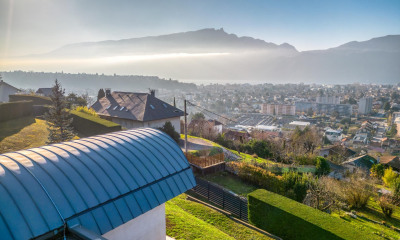 ANNECY SOTHEBY'S INTERNATIONAL REALTY vous propose de découvrir cette superbe maison de 210m2 habitable et 360m2 utile située sur les premiers hauteurs d'AIx-les-Bains, nichée au fond d'une impasse, dans un environnement paisible et verdoyant offrant un cadre de vie privilégié avec une vue panoramique sur le lac et les montagnes. Dès l'entrée, vous serez séduits par son vaste hall accueillant, desservant un wc visiteurs avec lave-mains. La cuisine entièrement équipée, complétée par un cellier-buanderie et donne à un accès direct au garage double, offrant praticité et fonctionnalité au quotidien. Une pièce de rangement supplémentaire complète cet espace. Le séjour et la salle à manger, spacieux et lumineux, s'étendent sur près de 80 m². Ils sont baignés de lumière naturelle grâce à de grandes baies vitrées et s'ouvrent sur une terrasse spectaculaire de 90 m². Un lieu parfait pour profiter de moments de détente face à un paysage remarquable. L'espace nuit propose un dégagement avec de rangements, deux chambres confortables reliées par une salle d'eau commune, ainsi qu'une suite parentale climatisée avec accès privé à la terrasse, dressing et salle de bain privative, wc. Une chambre au 1er étage Le sous-sol semi-enterré accueille une vaste pièce actuellement aménagé en salle de jeux qui peut également être transformé en studio indépendant, une cave à vin avec son coin dégustation, ainsi que 2 pièces de rangement. Parmi ses prestations : chauffage au sol, poêle à granulés, aspiration centralisée, volets roulants motorisés, alarme, des combles déjà isolés sous le toit pouvant être transformés en une quatrième chambre avec salle de bain. Le terrain de 1 424 m², entièrement clôturé et sécurisé par un portail électrique, est joliment arboré, agrémenté d'un potager et d'arbres fruitiers. Un cadre de vie idyllique, à proximité des écoles, du village et des transports en commun. A seulement 5 minutes d'Aix les Bains et des axes autoroutiers. ANNECY SOTHEBY'S INTERNATIONAL REALTY, votre expert dans la vente et la location de propriétés de luxe sur le bassin Annécien et les Aravis.