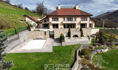 Propriété en position dominante sur 4,6 hectares, attenants, vallonnés et libre de fermage. Proche toutes commodités. A titre d'informations Sources ViaMichelin : Péage A43 Belmont Tramonet à 6,2 kms. Chambéry centre 34 kms. Construction : 2004 prestations haut de gamme, beaux volumes et grande luminosité, habitable de suite. Idéal résidence principale + activité pro. Surface habitable 604 m². (ascenseur) Rdc : entrée, grand hall donnant sur salon avec cheminée ouverte, séjour/cuisine entièrement équipée, cellier, bureau, chambre, salle de bains, dressing, bibliothèque, wc. R+1 : palier, chambre avec salle d'eau/wc, 3 chambres avec salle de bains/wc, dressing, mezzanine, bureau. R+2 : salle de sports & spa. Sous-sol : lingerie, salle d'eau, wc, salle de cinéma, salle de jeux, cave à vins, vestiaires, remises, atelier, chaufferie, garages véhicules. Dépendances : 836 m² Orangerie, wc, salle d'eau, bureau, garages, pièce avec groupe électrogène, local clim, ateliers, remises, hangar. Piscine chauffée. Parking extérieur. Entrée portail motorisé. Alarme. Dossier sur demande. Honoraires à la charge du vendeur Votre agent commercial 3G IMMO sur place EI - Denis GRISOLANO inscrit au RSAC de VIENNE n° 312 920 754 Selon l'article L.561.5 du Code Monétaire et Financier, pour l'organisation de la visite, la présentation d'une pièce d'identité vous sera demandée. Les informations sur les risques auxquels ce bien est exposé sont disponibles sur le site Géorisques :