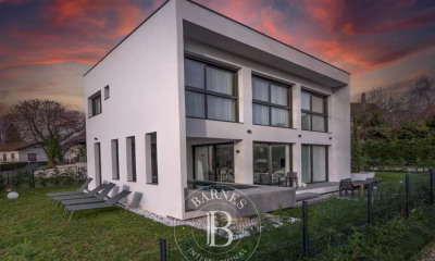 ANNECY SOTHEBY'S INTERNATIONAL REALTY vous propose cette magnifique villa d'architecte construite en 2012 située dans un environnement privilégié dans l'agglomération d'Annecy Nord et à 30 min de Genève (accès direct sur l'A41). Implanté sur un terrain de 1550 m², cette sublime villa de superficie de 220 m² comprenant 162 m² habitables ainsi qu'une superficie annexe habitable de 58 m². Cette villa exposé plein sud allie l'esprit contemporain avec tout le confort ainsi qu'une exceptionnelle vue panoramique dominant le lac d'Annecy et ses montagnes. Le premier niveau d'une superficie de 109 m² se compose d'un beau séjour baigné de lumière, d'une salle à manger lumineuse avec cuisine entièrement équipée de beaux matériaux, d'un cellier attenant, d'un spacieux bureau et d'un toilette invité. Cette pièce de vie est baignée de lumière grâce à ses grandes baies vitrées donnant accès à une splendide terrasse de 135 m² et à piscine chauffée de 10mx4,5m avec nage à contre-courant et buses de massage. Le terrain verdoyant est également agrémenté d'un potager et d'un petit verger. Le premier étage se compose de trois chambres, dont deux avec accès privatif à leur propre terrasse d'une superficie de 50 m² surplombant la piscine, le lac et ses montagnes. La master parentale est agrémentée d'une spacieuse salle de bains (douche à l'italienne et baignoire à remous) et d'un dressing, et les deux chambres d'une salle d'eau, et d'un toilette séparé. Garage double de 35 m², ainsi qu'un parking extérieur pouvant contenir 4 à 5 voitures. Studio indépendant de 25 m² avec point d'eau et toilette pour recevoir. Spacieuse buanderie, cave à vin. Pompe à chaleur alimentant la villa et la piscine, chauffage au sol et aspiration centralisée. ANNECY SOTHEBY'S INTERNATIONAL REALTY, votre expert dans la vente et la location de propriétés de luxe sur le bassin Annécien et les Aravis.