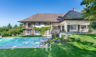 Exclusivité - Magnifique environnement calme et très recherché, sur la colline d'Annecy Le Vieux, et à deux pas du lac pour cette belle maison de famille à rafraichir. A l'abri des regards, cette propriété bénéficie d'un beau terrain plat piscinable afin de profiter pleinement de bons moments en famille ou entre amis. Elle profite également, de chacun de ses espaces de vie et terrasses, d'une très belle vue sur le lac, les montagnes ainsi que sur la ville d'Annecy, Construite en 1962, ce bien d'exception de 259 m² utiles a le cachet de l'ancien tout en étant parfaitement entretenue. Particulièrement chaleureuse et lumineuse - grâce à ses nombreuses ouvertures face au lac -, elle propose différents espaces de vie, intérieurs et extérieurs, qui invitent à la détente et au bien-être, au coin du feu ou dans le jardin. Son organisation est la suivante : - L'appartement principal, situé au rez-de-chaussée surélevé, comprend une entrée, une cuisine fermée avec accès balcon, un salon avec accès balcon et vue panoramique sur le lac et la ville, une grande chambre avec rangements et vue lac, une deuxième chambre / bureau avec rangements et vue lac, des toilettes séparées avec fenêtre, une salle de bain + douche - Le second appartement, dont l'accès se fait également au rez-de-chaussée, est situé au 1er étage de la maison et comprend une cuisine, un salon, une chambre avec vue lac, une salle de bain avec toilettes, une deuxième chambre avec balcon, un grand palier / bureau - Le 2e étage comprend un vaste grenier exploitable avec charpente d'origine et parquet - Le troisième appartement est situé en rez-de-jardin et comprend une cuisine fermée, un salon avec vue lac, deux chambres avec rangements, une salle de bain avec toilettes. Ce niveau comprend également un garage avec espace de stockage, une cave à vins, un cellier sous escalier, une buanderie avec fenêtre et chaudière - Ce bien est également agrémenté d'un grand garage indépendant Cette maison offre de belles possibilités d'extention et de transformation. Ses atouts : o Très belle vue panoramique sur le lac et la ville d'Annecy o Environnement calme à proximité immédiate du centre-ville o Magnifique parcelle de 1840 m² sans vis-à-vis o Propriété typique des années 60 avec beaucoup de charme et une belle possibilité d'évolution o Matériaux de qualité : sol du salon principal en marbre de Carrare avec joints en barres de laiton non scellées, o Chaudière de marque Viessmann, o Cheminée avec insert, o Portail motorisé, porte de garage motorisée, o Huisseries en chêne, o Douche en marbre de carrare, o Détecteur de présence, o Baies vitrées en un seul pan, o Portes intérieures et extérieures de qualité, o Possibilité d'exploiter le grenier o Très belle hauteur sous plafond o Terrain piscinable Ce bien est vendu sous réserve du droit d'usage et d'occupation.