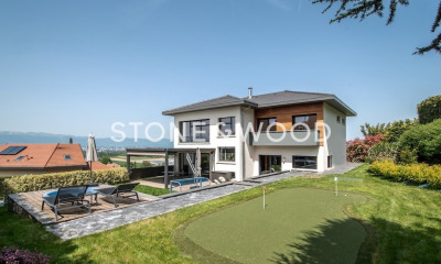Ref. 102JF : Swixim International a le privilège de vous présenter cette généreuse maison confortable (204 m² habitables), à la fois sobre et raffinée, offrant de beaux volumes, des espaces lumineux et des prestations résolument haut de gamme. Située en position dominante sur un terrain piscinable de 950 m², dans un quartier résidentiel et élégant de la commune de Bossey en Haute-Savoie, vous serez séduits par son aménagement extérieur et sa vue panoramique sur le bassin genevois, le lac Léman et son jet d’eau, ainsi que sur la chaîne du Jura, tout en profitant du soleil couchant tout au long de l’année. Édifiée sur trois niveaux, dont le rez inférieur dédié aux commodités (garage, entrée avec vestibule, buanderie), la maison propose un espace de vie spectaculaire de plus de 100 m² : séjour cathédrale, salon, cuisine aménagée et cellier, s’ouvrant sur la terrasse avec pergola bioclimatique et le jardin, offrant une impression de continuité parfaite entre intérieur et extérieur. À l’étage, vous bénéficierez d’une suite parentale (chambre avec balcon, dressing, WC, baignoire et douche), de deux chambres avec balcon communiquant et d’une salle de bains avec WC. La possibilité existe de réaliser une quatrième voir une cinquième chambre. Un bien d'une rare qualité, parfaitement situé. À découvrir sans tarder.