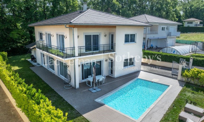 LAC LEMAN SOTHEBY'S INTERNATIONAL REALTY vous propose : Très belle propriété de caractère à deux pas du lac et de la frontière suisse. Implantée sur un terrain paysagé de 3700m², cette demeure vous charmera par sa quiétude, ses volumes et la vue exceptionnelle propice à la contemplation. Le niveau principal offre un espace de vie donnant sur une véranda agréable en toute saison, une grande cuisine ouverte sur la salle à manger et terrasse, un bureau, une chambre donnant ainsi qu'une salle d'eau. A l'étage, un salon avec cheminée dessert 2 chambres d'environ 35m², chacune avec balcon, dressing et salle de bain pouvant être divisées pour créer deux chambres supplémentaires. Le sous-sol, intégralement aménagé, comporte une salle de billard, une cuisine, une salle de sport, un espace détente avec Spa bénéficiant d'un accès direct à la piscine ainsi que 3 caves. Un garage double complète l'ensemble. Calme, espace, lumière et proximité du lac sont les atouts majeurs de cette demeure. LAC LEMAN SOTHEBY'S INTERNATIONAL REALTY, VOTRE EXPERT DANS LA VENTE DE PROPRIÉTÉS DE LUXE AU BORD DU LAC LÉMAN ET SES ENVIRONS.
