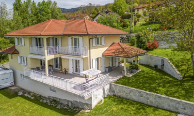 Située sur les hauteurs prisées de Cranves-Sales, cette demeure d'architecte de 280 m² habitables construite en 2017 sur une parcelle de 1216 m² bénéficie d'un emplacement exceptionnel, à deux pas de la frontière suisse et à moins de 10 minutes des douanes de La Renfile, Mon Idée, Moillesulaz ou Vallard. Le centre du village, ses écoles, ses commerces et son marché hebdomadaire sont accessibles en seulement 2 minutes. La partie principale de la maison au premier étage s'articule autour d'une pièce de vie de 83.35 m² baignée de lumière, ouverte sur une terrasse suspendue de 90 m² et d'une piscine avec un jardin et vue panoramique d'exception, allant du Mont-Blanc au Jet d'Eau de Genève jusqu'à Montreux et le lac Léman. La cuisine sur-mesure, entièrement équipée, s'intègre parfaitement à l'espace, et la cheminée centrale à double face vitrée apporte chaleur et élégance. Un WC visiteur et une chambre avec salle d'eau complètent ce niveau. À l'étage supérieur, l'espace nuit accueille quatre chambres spacieuses, dont une suite parentale de 45 m² avec salle de bain privative, baignoire balnéo, douche à l'italienne, dressing, WC et un balcon. Une seconde salle de bain avec baignoire, douche et WC complète ce niveau. Au rez-de-chaussée, deux chambres, une cuisine entièrement équipée et une salle d'eau avec WC offrent un espace indépendant pouvant être exploité en dépendance selon les besoins. Ce niveau donne également accès à un spacieux garage double de 45 m² avec atelier, à une buanderie, une cave, un local technique, ainsi qu'à un emplacement prévu pour l'installation d'un sauna. La maison, construite en béton intégral, dispose de nombreuses prestations haut de gamme : pompe à chaleur, chauffage au sol, classe énergétique A+, nombreux rangements, stationnements couverts et non couverts. Un bien d'exception alliant confort, volume, prestations et vue, dans un environnement verdoyant et calme à proximité immédiate de Genève.