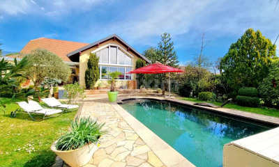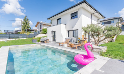 Située sur les hauteurs prisées de Cranves-Sales, cette demeure d'architecte de 280 m² habitables construite en 2017 sur une parcelle de 1216 m² bénéficie d'un emplacement exceptionnel, à deux pas de la frontière suisse et à moins de 10 minutes des douanes de La Renfile, Mon Idée, Moillesulaz ou Vallard. Le centre du village, ses écoles, ses commerces et son marché hebdomadaire sont accessibles en seulement 2 minutes. La partie principale de la maison au premier étage s'articule autour d'une pièce de vie de 83.35 m² baignée de lumière, ouverte sur une terrasse suspendue de 90 m² et d'une piscine avec un jardin et vue panoramique d'exception, allant du Mont-Blanc au Jet d'Eau de Genève jusqu'à Montreux et le lac Léman. La cuisine sur-mesure, entièrement équipée, s'intègre parfaitement à l'espace, et la cheminée centrale à double face vitrée apporte chaleur et élégance. Un WC visiteur et une chambre avec salle d'eau complètent ce niveau. À l'étage supérieur, l'espace nuit accueille quatre chambres spacieuses, dont une suite parentale de 45 m² avec salle de bain privative, baignoire balnéo, douche à l'italienne, dressing, WC et un balcon. Une seconde salle de bain avec baignoire, douche et WC complète ce niveau. Au rez-de-chaussée, deux chambres, une cuisine entièrement équipée et une salle d'eau avec WC offrent un espace indépendant pouvant être exploité en dépendance selon les besoins. Ce niveau donne également accès à un spacieux garage double de 45 m² avec atelier, à une buanderie, une cave, un local technique, ainsi qu'à un emplacement prévu pour l'installation d'un sauna. La maison, construite en béton intégral, dispose de nombreuses prestations haut de gamme : pompe à chaleur, chauffage au sol, classe énergétique A+, nombreux rangements, stationnements couverts et non couverts. Un bien d'exception alliant confort, volume, prestations et vue, dans un environnement verdoyant et calme à proximité immédiate de Genève.