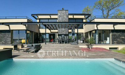 Villa contemporaine avec vue imprenable et piscine. Construite en 2023, cette magnifique villa contemporaine de 310 m² sur une parcelle de 1 825 m² offre une vue dégagée et un cadre de vie privilégié. Profitez d'une piscine chauffée extérieure (8 x 4m) avec volet roulant solaire, et de grands espaces lumineux conçus avec des matériaux haut de gamme. Au rez-de-chaussée, une entrée avec placards, un salon chaleureux avec cheminée à l'éthanol, une cuisine haut de gamme ouverte sur la salle à manger, une suite parentale avec dressing, salle de bains + douche et wc, deux chambres avec une salle de douche commune et wc. Un wc indépendant. De nombreuses pièces ont accès à la terrasse autour de la piscine. À l'étage, une mezzanine aménagée en bureau et une seconde suite avec salle de douche, wc et terrasses privées. Le souplex comprend un espace loisirs avec salle de jeux, salle de sport, home cinéma, une chambre, une lingerie, ainsi qu'un dressing et des rangements optimisés. À l’extérieur, un garage double, stationnements supplémentaires et un environnement calme et verdoyant. Équipements de qualité : chauffage au sol, VMC, domotique, fibre optique, portail automatisé. À 15 minutes d'Orgeval, accès rapide à l’A13/A14 pour Paris. Le village de BAZEMONT, au cœur de la vallée de la Mauldre et ses espaces boisés, se situe à 15 minutes des accès autoroutiers d’Orgeval et d’Epône permettant de relier facilement Paris ou la Normandie. Rattachée à la commune de Maule (à 8 minutes) pour la vie économique et les commerces, le village possède une école primaire et des ramassages scolaires pour le collège (Maule) et lycée (Aubergenville) et de nombreuses associations. Bus pour Maule SNCF et Poissy SNCF/RER.