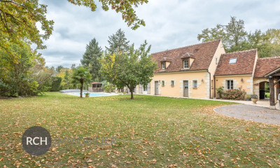 Propriété de charme de 230 m² environ entièrement rénovée récemment sur un terrain clos de 1.8 hectares environ avec dépendances, au calme et vue sur de beaux espaces dégagés et la forêt. La maison principale est composée d'une entrée sur un espace de réception (75 m²) avec cheminée, cuisine séparée par des verrières en métal, dégagement vers espace parental de plain-pied (chambre / dressing / salle de bains - 35 m²), wc, chaufferie et buanderie. L'étage est desservi par 2 escaliers : dégagements vers 3 grandes suites complètes (chambre salles de bains et douche - wc - dressing/rangements). Nombreuses dépendances : grande salle de jeux vitrée attenante à la maison avec vue sur le jardin, salle de sport, plusieurs garages chauffés, pool house avec cuisine d'été et wc… Piscine en structure béton, chauffée, 12x5. Tennis. Restauration complète des bâtiments avec de beaux matériaux confrontant la chaleur du bois et la modernité du métal et du béton : verrières, planchers massifs et poutres sablées, escalier à vis… De très grandes ouvertures et nombreuses offrent de belles vues sur l'extérieur et l'assurance d'avoir une bonne luminosité. Terrain arboré, paysagé et éclairé. A quelques minutes de tous commerces, gare et écoles. Beaucoup de charme et en parfait état.