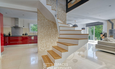 MAISON CONTEMPORAINE MÉRÉ Cette maison contemporaine de 190m2 au calme absolu se situe sur un terrain de 1 200 m2, Maison familiale calme et lumineuse offrant de très beaux espaces de vie donnant accès sur le jardin Au rez-de-chaussée, un esprit loft avec une triple exposition d'environ 65 m2 est composé d'un salon avec un poêle à bois, une salle à manger et une cuisine dinatoire . Une grande chambre en rez-de-chaussée avec sa salle d'eau, des toilettes séparés et un cellier-buanderie complètent ce niveau. Au premier étage, un spacieux palier lumineux , une suite parentale avec salle de bains et dressing, 2 chambres, une salle d'eau et des toilettes séparés. Beau terrain sans vis à vis au calme avec. Un garage et un carport complètent l'ensemble. Le terrain est piscinable Proximité des commerces et des écoles de Montfort, et à 5 minutes de la gare direct Paris-Montparnasse.