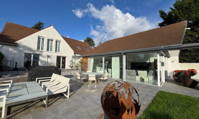 Située à Bazemont à 15 min d'Orgeval, cette remarquable villa récente, bâtie en 2023 sur une parcelle de 1825m² agrémentée d'une piscine extérieure (8 x 4m) équipée d'un volet roulant solaire offre une vue exceptionnelle sur la campagne environnante. Elle vous enchantera par ses volumes et sa luminosité ainsi que par la qualité des matériaux utilisés où l'isolation fait partie d'un des atouts majeurs de cette construction pour le bien-être de ses propriétaires. Avec une superficie de 310m² (dont 110m² ont été aménagés au niveau inférieur en espace de vie) décorés avec raffinement et répartis sur 3 niveaux, dans un esprit contemporain, elle présente : Au rez-de-chaussée : une entrée qui s'ouvre sur un salon doté d'une cheminée à l'éthanol, une cuisine haut de gamme entièrement équipée ouverte sur la salle-à-manger créant un esprit convivial. Un espace familial comprend deux chambres pour enfants (une avec placards, l'autre avec dressing) avec une salle de douche commune et des toilettes ainsi qu'une suite parentale luxueuse avec salle de bains privative, toilettes et dressing. Un cellier/chaufferie et des toilettes invités complètent ce niveau. De nombreuses pièces s'ouvrent sur une terrasse autour de la piscine. A l'étage supérieur, une vaste mezzanine aménagée en bureau offre un espace de travail paisible menant à une seconde suite avec salle de douche privative, toilettes et deux terrasses exclusives. A l'étage inférieur, un véritable espace de loisirs réserve d'agréables surprises : des rangements multiples et bien pensés, une buanderie/lingerie, un dressing spacieux et des espaces dédiés aux loisirs et à la détente : salle de jeux, salle de sport, home cinéma et une chambre supplémentaire. Un atelier et un local technique pour la piscine complètent ce niveau. A l'extérieur, un garage spacieux pouvant accueillir deux voitures, une moto et des vélos. Un parking supplémentaire est prévu pour les invités. Le nec plus ultra des équipements a été intégré pour un confort de vie optimal : chauffage au sol dans toute la maison par une pompe à chaleur, VMC double-flux (rez-de-chaussée et 1er étage) et simple flux (sous-sol), menuiseries en aluminium, stores électriques, arrosage automatique, portail automatisé, domotique Somfy et fibre optique. A 15 minutes en voiture des accès autoroutiers d'Orgeval pour l'A13/A14 pour Paris et à 10 minutes de la Gare d'Aubergenville/Elisabethville, accès direct au futur RER E qui reliera La Défense en moins de 40 minutes dès 2027 . Ecole primaire dans le village et ramassages scolaires pour le collège à Maule et le Lycée à Aubergenville. Les informations sur les risques auxquels ce bien est exposé sont disponibles sur le site Géorisques