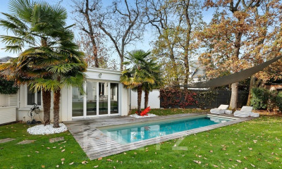 Le Vésinet – Maison familiale de 420 €m² sur un terrain verdoyant de 1 €270 €m². Au rez-de-jardin : vaste séjour traversant avec cheminée centrale, salle à manger attenante, cuisine indépendante, une suite parentale, bureau/bibliothèque avec cheminée. Accès direct à une grande terrasse ensoleillée. À l'étage : une deuxième suite parentale, sept autres chambres, balcons avec vue sur le jardin. En sous-sol : salle de sport, buanderie, cave à vin, espaces de rangement. Prestations : alarme, interphone, vidéophone, garage fermé, stationnements complémentaires. À proximité du RER A (accès rapide à Paris en transports ou par la route), des écoles réputées et des commerces de quartier.