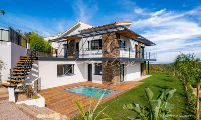 Superbe villa avec vue panoramique jusqu'à la baie de Cannes, piscine et belles prestations dans un cadre résidentiel paisible. Venez découvrir cette magnifique villa sans vis-à-vis,climatisée, située dans un secteur résidentiel sécurisé et très calme à seulement quinze minutes de Mandelieu. Elle offre une vue panoramique exceptionnelle sur la mer et les Iles de Lérins ainsi qu'une exposition ensoleillée tout au long de la journée. Cette propriété de grande qualité vous séduira par ses volumes généreux, ses finitions soignées et ses équipements haut de gamme. La propriété, d'une superficie de 211m2 sur 1331m2 de terrain est répartie sur 2 niveaux : Elle propose de plain-pied un lumineux séjour de 67 m² avec cheminée, agrémenté d'une cuisine attenante de 16 m² prolongé par une arrière-cuisine. L'ensemble donne sur une grande terrasse, idéale pour vos moments de détente en extérieur, avec un salon extérieur abrité orienté plein Sud. Un coin nuit avec deux grandes chambres ouvertes sur l'extérieur, une salle de bains et 2 WC. A l'étage, une chambre suite parentale donnant sur une vaste terrasse avec une vue panoramique sur les collines et la mer et un dressing privatif. Vous y trouverez également une salle de bains avec balnéo, un WC et un vaste bureau donnant sur une grande terrasse. Un jardin superbement paysagé, organisé autour d'une belle piscine à débordement. La propriété dispose également de nombreuses places de parking, d'un double garage aménageable avec une borne de recharge et d'un abri de jardin attenant. Aéroport Nice 35 min. Cannes 17 km. Commerces 1 km. Double vitrage. Climatisation réversible. Cheminée. Interphone. Alarme. Fibre. Portail motorisé. Contact Ingrid ou Les informations sur les risques auxquels ce bien est exposé sont disponibles sur le site Géorisques :