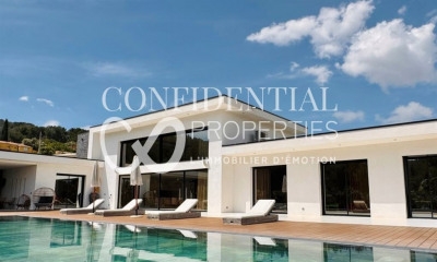 83150 BANDOL- Riva Immobilier Luxury 83 vous propose cette magnifique villa contemporaine vue mer de 235m² plus garage de 48m² avec piscine à débordement de 13.80mX3m chauffée.sur un terrain clos et arboré de 530m², proche centre ville à pied, commerces, école, gare SNCF.Dans un environnement calme et privilégié, exposée sud, sans nuisance. Elle se compose en rez de chaussée : D'un hall-dressing-wc-salon-séjour-cuisine Américaine équipée de 68m². Etage : Deux chambres-salle de bain-salle d'eau- deux dressings-wc indépendant. En rez de jardin : Deux chambres-une salle d'eau-wc indépendant-salon télé-garage. Prestations haut de gamme et de qualité, Beaucoup de charme à voir. RARE SUR SECTEUR- Tél :