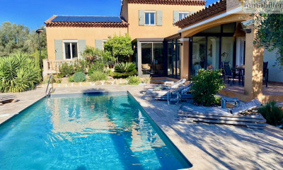Edifiée en position dominante, très belle villa contemporaine offrant une vue panoramique sur la campagne. La villa de 230 m² se compose d'une vaste pièce de réception traversante de plus de 80 m², baignée de soleil, ouvrant sur les terrasses et le spa de nage; d'un grand espace parental, et de deux chambres avec une salle de douche indépendante. Un bel appartement indépendant avec terrasse et jardin se trouve sur le niveau inférieur. Une salle de cinéma, une salle de sport, et un garage complètent l'ensemble. À seulement 5 minutes de l'A50, quelques minutes des plages de Bandol et Sanary-sur-Mer et 20min de Toulon. Très belles prestations, bien rare à la vente. Ce bien est situé dans une zone soumise à l’obligation de débroussaillement. Les informations sur les risques auxquels ce bien est exposé sont disponibles sur le site Géorisques : www.georisques.gouv.fr