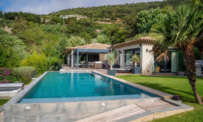 EXCLUSIVITÉ – Villa rénovée avec 6 suites, piscine et jardin paysager – Proche de Port Grimaud Située dans un domaine privé et sécurisé, à seulement 1,5 km de la mer et de la cité lacustre de Port Grimaud, cette élégante propriété rénovée en 2024 offre un cadre de vie paisible au cœur d'un environnement naturel, à proximité immédiate des plages et des commodités du Golfe de Saint-Tropez. Édifiée sur un terrain arboré de plus de 2 400 m², la villa développe une surface habitable d'environ 300 m² et se distingue par ses volumes généreux, sa luminosité et ses prestations contemporaines. Le rez-de-jardin accueille un vaste espace de réception composé d'un double salon ouvrant sur une grande terrasse ombragée, idéale pour les repas en extérieur et les moments de détente. Quatre chambres en suite, disposant chacune d'un accès indépendant vers le jardin, se partagent un salon bibliothèque confortable, parfait pour une vie de famille ou des séjours entre amis. À l'étage, deux chambres supplémentaires, également en suite, sont parfaitement isolées des espaces de vie, garantissant calme et intimité. Les extérieurs ont été pensés pour la détente et le plaisir : piscine avec pool house entièrement équipé, douches extérieures, terrain de pétanque, ainsi qu'un jardin paysager méditerranéen facile d'entretien. Un espace de 50 m² en sous-sol, sous la terrasse, offre un beau potentiel d'aménagement en salle de sport, espace bien-être ou home cinéma selon les besoins. Offrant une belle vue dégagée et baignée de lumière, cette villa à l'architecture soignée combine parfaitement confort moderne, élégance et situation privilégiée. Elle conviendra aussi bien pour une résidence principale que secondaire. Ce bien rare vous est présenté en exclusivité par Côte d'Azur Sotheby's International Realty, votre référence de l'immobilier de prestige dans le Golfe de Saint-Tropez. Contactez notre Private Desk pour plus de renseignements ou organiser une visite confidentielle.