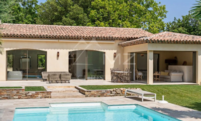 À quelques pas du golf et des plages, nichée dans un domaine fermé et sécurisé, cette villa de 180 m² habitables incarne tout le charme provençal au coeur d'un écrin de verdure plat et soigneusement paysager. Son architecture aux lignes classiques, ses volets aux teintes claires et son jardin généreux soulignent un art de vivre à la fois raffiné et authentique sur la Côte d'Azur. Dès l'entrée, les espaces de vie séduisent par leur atmosphère lumineuse et chaleureuse. Le spacieux séjour avec cheminée se prolonge naturellement vers la terrasse couverte, créant un dialogue harmonieux entre intérieur et extérieur. La villa dispose de quatre chambres confortables, chacune tournée vers le jardin et un garage complète les prestations. À l'extérieur, la piscine entourée de pelouse naturelle offre un cadre de détente intimiste, parfait pour savourer les journées ensoleillées du Golfe de Saint-Tropez. Un lieu où la douceur provençale rencontre la sérénité, pour vivre pleinement l'art de vivre méditerranéen à Grimaud.