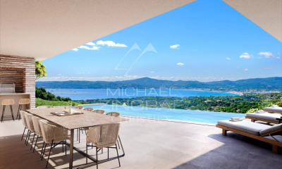Située dans un domaine privé à deux pas du Golf Club de Beauvallon, cette villa contemporaine d’environ 450 m² offre une belle vue panoramique sur la mer, la nature environnante et le village de Saint-Tropez en face. Construite avec des matériaux de qualité et décorée avec goût, la maison propose de beaux volumes, une grande pièce à vivre lumineuse et entièrement ouverte, ainsi que 4 chambres confortables avec chacune sa propre salle de bain. Bien situé dans une zone soumise à l'obligation de débroussaillement Fonctionnelle et bien pensée, la villa dispose de prestations haut de gamme : climatisation réversible, chauffage au sol, système audio intérieur/extérieur, alarme, vidéosurveillance, garage double. Les extérieurs sont parfaitement aménagés avec plusieurs terrasses en teck, un salon d’été couvert, un toit-terrasse avec vue panoramique, et une piscine à débordement chauffée au sel. Le terrain plat de 3 200 m² est paysagé avec des essences méditerranéennes (palmiers, cactus, chênes-lièges), et bénéficie d'une exposition plein sud. La propriété est vendue meublée, avec deux abonnements au Golf de Beauvallon et une voiturette de golf. Un bien idéal pour les amateurs de golf, de nature et de confort moderne. Léa HEPP - Agent commercial - EI - RSAC 898 326 897