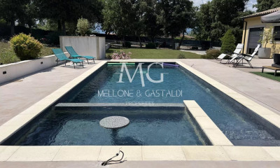 Élégance, qualité irréprochable et harmonie définissent cette propriété exceptionnelle. Située à environ dix minutes à pied du charmant village de Montauroux, la villa est entourée de son jardin enchanteur. La propriété, d'une surface habitable de 237 m², comprend un hall d’entrée accueillant, un spacieux séjour lumineux avec cheminée, une salle à manger ouverte sur la terrasse, ainsi qu’une cuisine américaine. On trouve également un bureau, un WC, une salle de bain et 3 chambres au rez-de-chaussée. À l’étage, une chambre donne sur une terrasse couverte, accompagnée d’une salle d’eau et d’un WC. Le niveau inférieur abrite un appartement composé d’un hall d’entrée, d’une cave, d’une cuisine entièrement équipée ouverte sur l’espace repas et d’un petit atelier. Cet appartement comprend également 2 chambres, une salle d’eau, un WC et une belle terrasse. À l’entrée de la propriété, un carport et des places pour quatre voitures supplémentaires sont disponibles. Les menuiseries en chêne massif clair sont d’une qualité exceptionnelle. Le terrain de 2500 m² est magnifiquement paysagé avec des rosiers, de la lavande et des oliviers, descendant doucement vers l’espace piscine. La piscine, mesurant 10 x 5 mètres, est entourée d’espaces généreux pour dîner, se détendre et profiter des plaisirs aquatiques. Un grand espace cuisine d’été se trouve à proximité, accompagné d’un terrain de pétanque. Cette propriété rare offre calme, repos et harmonie, que ce soit pour des moments en petit comité ou pour des rassemblements plus importants.
