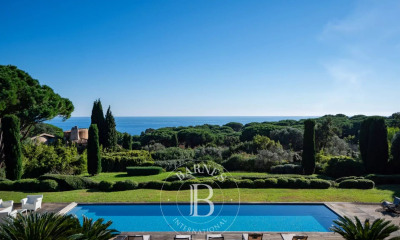 Dans le quartier de La Quessine, réalisé par un architecte de renom, situé à quelques minutes à pied des plages de Pampelonne et de L'Escalet et seulement dix minutes du centre de Saint-Tropez. Je vous présente une superbe villa contemporaine d'inspiration Art Déco d'env. 400m² lovée dans un écrin de verdure de 1.2 hectares aux essences méditerranéennes. Elle offre 6 chambres en suite dont 2 de plain-pied. Une spacieuse salle à manger avec cuisine ouverte sur terrasses. Le parc paysager comprend un espace piscine bordé de bois exotique, un terrain de boules, un espace barbecue, un car port, une gloriette, un chalet en bois aménagé avec une chambre, une salle de douche et une kitchenette. Les vues ouvertes sur la mer sont un émerveillement quotidien. Un petit chemin confidentiel descend à la mer en quelques minutes pour des baignades en toute tranquillité. Commerces à moins de cinq minutes en voiture offrant tout le nécessaire. Le prix de présentation comprend les honoraires à la charge des acquéreurs. Autres biens du même rang nous consulter. Charles TARDY +33 (0)6 75 68 14 98