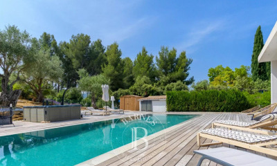 Entre Bandol et La Ciotat, dans un domaine privé de 70 ha en bord de mer, une maison contemporaine de plain-pied d'environ 270 m² sur 4200 m² de terrain. Une petite route à flanc de colline, d'où la mer surgit à chaque instant, grimpe sur quelques kilomètres entre les pins jusqu'à l'entrée du domaine marquée par une barrière. Une large allée dessert les accès secondaires, tous goudronnés, qui quadrillent le domaine. Au centre de celui-ci, au bout d'une impasse longue de quelques dizaines de mètres et via un portail automatique, la propriété à l'architecture contemporaine se dévoile. Elle s'étend sur un terrain de forme trapézoïdale, quasiment plat, et entièrement clos de plus de 4200 m². Coiffée de toits à un ou deux pans en tuiles canal, elle est exposée au sud avec des baies orientées à l'est et à l'ouest. Un double garage en retour d'équerre accolé à la façade nord jouxte une aire de stationnement gravillonnée qui marque également l'entrée de la maison protégée par un auvent. Un terrain de pétanque à l'ombre de grands pins s'étend en limite ouest du jardin, qui a fait l'objet d'un aménagement paysager, soigneusement entretenu depuis.