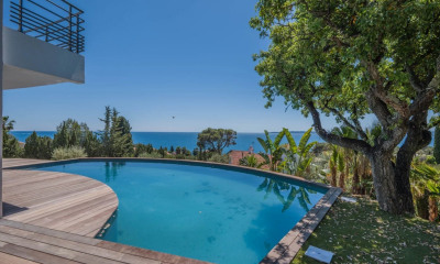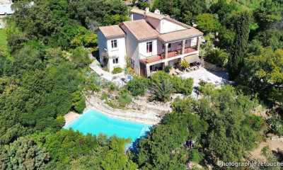 En exclusivité chez Excellence Immobilier. A proximité immédiate des plages, dans un domaine fermé cette jolie villa provençale avec vue mer offre : un hall d'entrée, un lumineux séjour avec cheminée, une salle à manger, une cuisine indépendante aménagée. 4 chambres avec salles de douches. Sous sol complet avec atelier, cave et garage. Piscine traditionnelle de 10 X 5 chauffée. Terrain paysagé de 1815 m2.