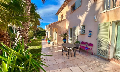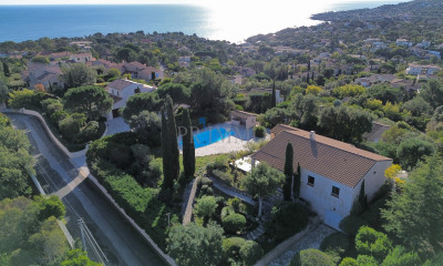 A VENDRE EN EXCLUSIVITE, Villa de style "provençal" avec une très jolie vue mer sur la Baie de Saint-Raphaël. Elle propose de plain-pied un lumineux séjour avec une cheminée, belle hauteur sous plafond "cathédral", une salle à manger, une cuisine contemporaine équipée et aménagée, 2 grandes chambres dont une ouverte sur une véranda prolongée par une agréable terrasse, une salle de bains et une chambre/ou bureau. Ces espaces de vie sont prolongés par de larges terrasses semi-couvertes. A l'étage, deux chambres en suite dont la master avec une vue panoramique sur les collines et la mer, salle de douche et dressing, ainsi que sa terrasse. Un jardin superbement paysagé, organisé autour d'une piscine au sel chauffée. Une cuisine d'été, une cave, un garage et des places de parking extérieures viennent compléter cette propriété La villa peut s'envisager meublée ! UN BEAU COUP DE COEUR