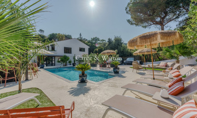 VILLA PIEDS DANS L'EAU, de conception moderne et contemporaine, située dans un environnement calme et privilégié, avec accès direct à la mer et petite. Tout a été conçu pour apporter lumière, confort et praticité, le tout aux prestations soignées. Le jardin clos de 1020 m² a été totalement complanté de palmiers et agrémenté d'une piscine. La terrasse solarium, avec jacuzzi et cuisine d'été, vous permettront de profiter de la mer à l'infini. Double réception de 90 m2 avec cuisine équipée, 5 chambres avec salles d'eau et wc dont une chambre principale avec salle de bains intégrée. Garage. A pieds des commerces. 25 mn de St Tropez.
