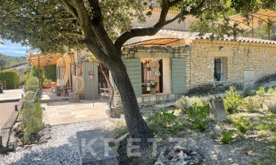 La propriété se compose d'une maison principale et d'une dépendance, offrant un cadre de vie agréable et pratique. Dans la maison principale, vous serez accueilli en entrant par une grande pièce de vie lumineuse comprenant un séjour, une salle à manger et une cuisine entièrement équipée ouvrant sur l'extérieur. Au rez-de-chaussée se trouvent également une chambre avec salle d'eau et WC, ainsi que des WC visiteurs. À l'étage, un hall dessert deux chambres partageant une salle d'eau et des WC. Depuis la cour Est, la dépendance offre deux chambres supplémentaires, chacune avec leur propre salle d'eau. L'emplacement et l'aménagement du terrain constituent l'un des principaux atouts de cette propriété : située à flanc de colline, elle offre des vues panoramiques sur le Luberon et une exposition plein sud. Le terrain est entièrement clos et planté majoritairement d'arbres fruitiers, de cyprès, d'une oliveraie en production (environ 200 litres d huile) et de lavande. L'irrigation est assurée par le Canal de Provence. La propriété dispose également d'un portail électrique, d'une aire de stationnement couverte, d'une tonnelle ombragée idéale pour les repas en plein air et d'une magnifique piscine chauffée de 10 x 5 mètres, équipée d'un volet roulant électrique.
