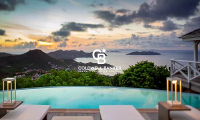 Niche´e dans un lieu unique de l’i^le, face a` la baie de Marigot et dote´ de sa plage prive´e, de´couvrez cette somptueuse villa conc¸ue par l’architecte Nicolas Gessat. Cette re´alisation au style carai¨be´en et contemporain offre une incroyable e´le´gance. L’acce`s se fait a` travers un beau jardin paysage´ ou une magnifique vue sur la baie commence a` faire surface tout comme l’ensemble des pie`ces de la villa. L’espace de vie offre un magnifique un remarquable se´jour ou` se trouve cuisine, salon et salle a` manger sous une charpente se fondant dans un environnement chaleureux. Les terrasses apportent un inde´niable prolongement de l’espace de vie be´ne´ficiant d’une piscine a` de´bordement. Sur ce me^me niveau se trouve une premie`re suite avec un acce`s prive´e a` la piscine. Puis se trouve 4 autres suite inde´pendant repartie dans 2 bungalows avec terrasse privative. Un acce`s direct a` la plage se fait par quelque marche, sur cet espace de vie rare et unique se trouve une cuisine et un espace dinatoire a` l’intimite´ parfaite. Une salle de gym et un parking 4 places comple`te cette villa d’exception.
