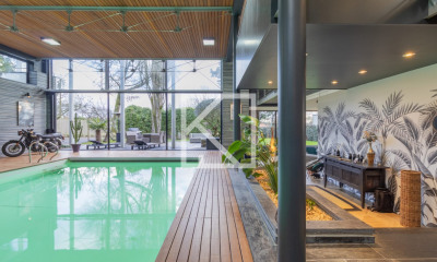 Dans un village de Vendée, à proximité des Herbiers et du Puy-du-Fou, une ancienne école du 19e s. aménagée en maison d'hôtes et en gîtes, avec jardin. Édifiée au milieu du 19e s., la propriété est une ancienne école qui a fait l'objet d'une rénovation approfondie il y a une vingtaine d'années. Le portail d'entrée, surmonté d'un fronton finement ouvragé, marque l'entrée de la propriété. Le bâtiment principal est élevé sur deux niveaux, sous une toiture en tuiles. Le logis est prolongé par deux ailes qui dessinent une cour carrée. Ses pignons comprennent, d'un côté, un préau et, de l'autre, une aile supplémentaire, pour la partie privée de la demeure. Devant la façade nord-est s'étendent une terrasse et un jardin, avec piscine chauffée. Une seconde terrasse ainsi qu'un préau idéal pour les jeux d'enfants complètent les espaces extérieurs. Un appartement indépendant, distinct des espaces réservés à la clientèle, est composé de trois chambres et d'une vaste pièce de vie.