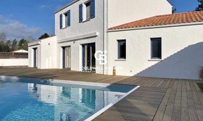 Dans le Marais Breton Vendéen, à quelques kilomètres seulement de l'océan, une vaste longère, sa maison d'amis et sa piscine, sur un terrain de 4400 m². La propriété est entourée d'étiers et de canaux. L'eau sert de clôture naturelle au sud tandis que des haies bocagères de tamaris bordent la petite route d'approche. L'accès s'effectue par un portail à double battant encadré de piliers blancs. Il ouvre sur une allée engazonnée qui conduit en douceur jusqu'à la maison de 232 m², après avoir laissé sur un côté un logement indépendant de 32 m² environ, que jouxte un garage de 33 m² environ. Le développement en longueur et de plain-pied des deux bâtiments est typique des hameaux ruraux vendéens. Sur un plan en U, la longère déploie une silhouette fidèle à l'architecture traditionnelle désormais adaptée à un art de vivre contemporain. Des toitures à deux versants et à faible déclivité se distinguent nettement dans le paysage par la couleur orangée de leurs tuiles romanes. Elles sont soulignées par une génoise travaillée. Les murs en pierre sont couverts d'un crépi de teinte blanche qui réagit au moindre rayon de soleil. Les volets, peints d'un bleu grisé, rappellent les reflets de l'océan tout proche, Le corps principal, encadré de deux ailes ajoutées, enserre un vaste espace d'agrément. Au centre, la piscine aux reflets turquoise et le spa composent un havre de détente, protégé des vents et des regards par une végétation luxuriante. Palmiers, oliviers et arbustes d'essences méridionales y créent une atmosphère presque insulaire. Autour, le terrain s'étend en un vaste tapis de verdure d'environ 4400 m², ponctué d'arbres matures et d'arbustes variés, qui apportent ombre et intimité à l'ensemble.