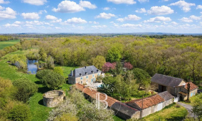 À 10 min de Poitiers, sur 2 ha avec piscine, une maison de maître du 18e s., entièrement rénovée. Une petite route de campagne longe la propriété pour rejoindre ses deux entrées. La première est constituée d'un porche avec une porte en bois et la seconde, d'un portail doublé d'une grille. Après la première entrée, des garages précèdent une aile, devant laquelle a été aménagée une terrasse. Au bout de ce bâtiment en retour en L, s'élève le bâtiment principal, rehaussé par un petit jardin à la française. Pour la partie principale, un enduit a été appliqué sur toutes les façades avec les chaînages d'angle comme les encadrements de baie en pierre. L'aile, présente un appareillage en pierre. Les toitures sont en tuiles canal. Toutes les huisseries sont à double vitrage. Entre la maison et les garages, un bassin alimenté par une source a été creusé au 18e s. Le jardin s'étend à l'arrière et en contrebas, avec une piscine à la même hauteur que la maison et la seconde entrée.