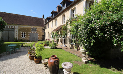 À 2 h de Paris, à l'orée d'un village bourguignon, une élégante maison de maître, entourée d'un parc arboré et ses multiples essences florales. Le village est résidentiel et étendu, jalonné de maisons élégantes dissimulées dans la nature. Un double portail imposant et ouvragé, en fer forgé, est soutenu par deux grands piliers en pierre. Il donne sur une cour intérieure gravillonnée, ponctuée d'un parterre de pelouse bien dessiné. Un grand platane est placé de chaque côté de la grille. Un escalier aux larges marches monte vers une seconde cour, traversée par une allée centrale en pierre et bordée d'un muret en pierre, rehaussé d'une clôture en ciment peinte en blanc qui la sépare d'une végétation luxuriante. En surplomb, la maison de maître domine le parc. Datée du milieu du 19e s., elle est occupée par la même famille depuis 1931 : trois générations de forestiers, devenus exploitants d'une scierie puis d'un commerce de combustibles. Le logis est élevé de deux niveaux. La façade principale de pierre blanche, orientée au sud, est animée de nombreuses baies, doublées de contrevents en bois plein ou de persiennes. Les encadrements et dessus des baies sont identiques aux chaînages d'angle. Le rez-de-chaussée se distingue par sa porte d'entrée en verre, surmontée d'une élégante marquise récemment restaurée. La toiture en ardoise à quatre pans est percée d'une fenêtre lucarne. À l'ouest, une ancienne véranda prolonge le bâtiment, avec une grille qui permet de fermer l'espace ou au contraire de l'ouvrir sur le parc. Face à la demeure, un ancien cadran solaire est toujours en état de fonctionnement et des bancs d'origine sont placés à chaque extrémité. S'ensuit un grand espace, soigné et ordonné, planté d'arbres plusieurs fois centenaires, qui ménage plusieurs recoins aux atmosphères différentes. Une grande allée de tilleuls forme une voûte forestière, auprès des ruines d'une ancienne cheminée sculptée. De petites ouvertures en alcôve conduisent vers d'autres espaces arborés. Une autre entrée est placée derrière la maison, proche d'une ancienne mare. À l'est, un passage pavé conduit au caveron. Plus en hauteur, une terrasse est bordée d'un petit mur en pierre sèche. Sur l'ensemble du parc, deux terrains restent constructibles : l'un en bas et le second, placé derrière la maison, à proximité d'un troisième accès.